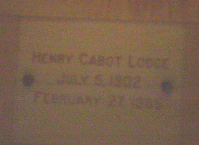Henry Cabot Lodge Lodge was on the Republican ticket in 1960 with Richard Nixon. He is buried in Mount Auburn Cemetery, Cambridge, Mass. Lodge is buried in a family crypt. It is very dark and difficult to see inside, but I was able to get a shot of his actual plaque. The photo came out dark, but I was able to lighten it. Date of Visit: November 15, 2008 |