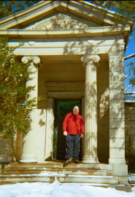 Mausoleum. If you look in the windows, his crypt is on the right side.